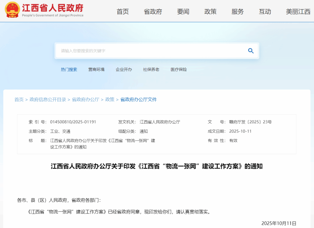 江西省人民政府办公厅关于印发《江西省“物流一张网”建设工作方案》的通知